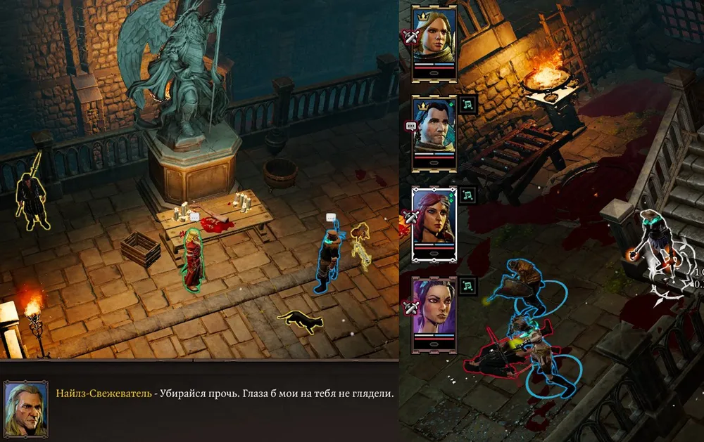 Осталось посетить Найлза-свежевателя… Как обычно, начал по одному выдёргивать его монахов. Когда дело дошло до големов, их хозяин обиделся, ринулся в бой и пришлось удирать. Зато потом, когда к нему вернулся только Сандор, обиженный садист вступил в разговор: спутницы героя только этого и ждали!
