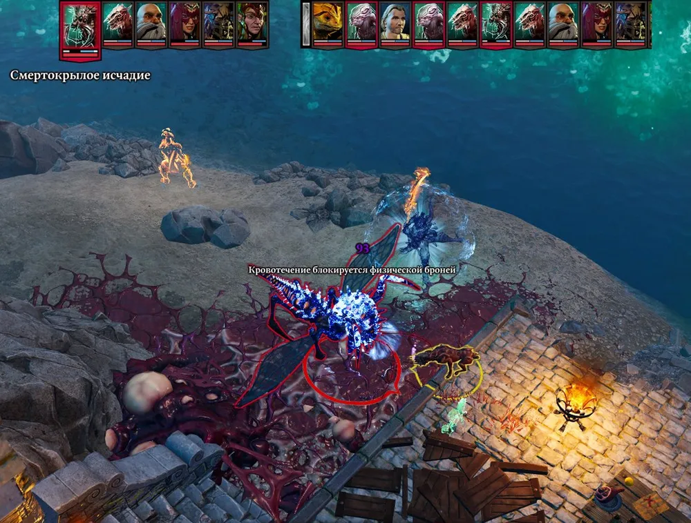 В разрушенную крепость можно прийти сверху, по скалам, а можно через ворота. Если сверху - ядокрылое исчадие успеет улететь. Вбегаем через ворота, уничтожаем, и убегаем, чтобы зайти сверху – остальные враги никуда не денутся.