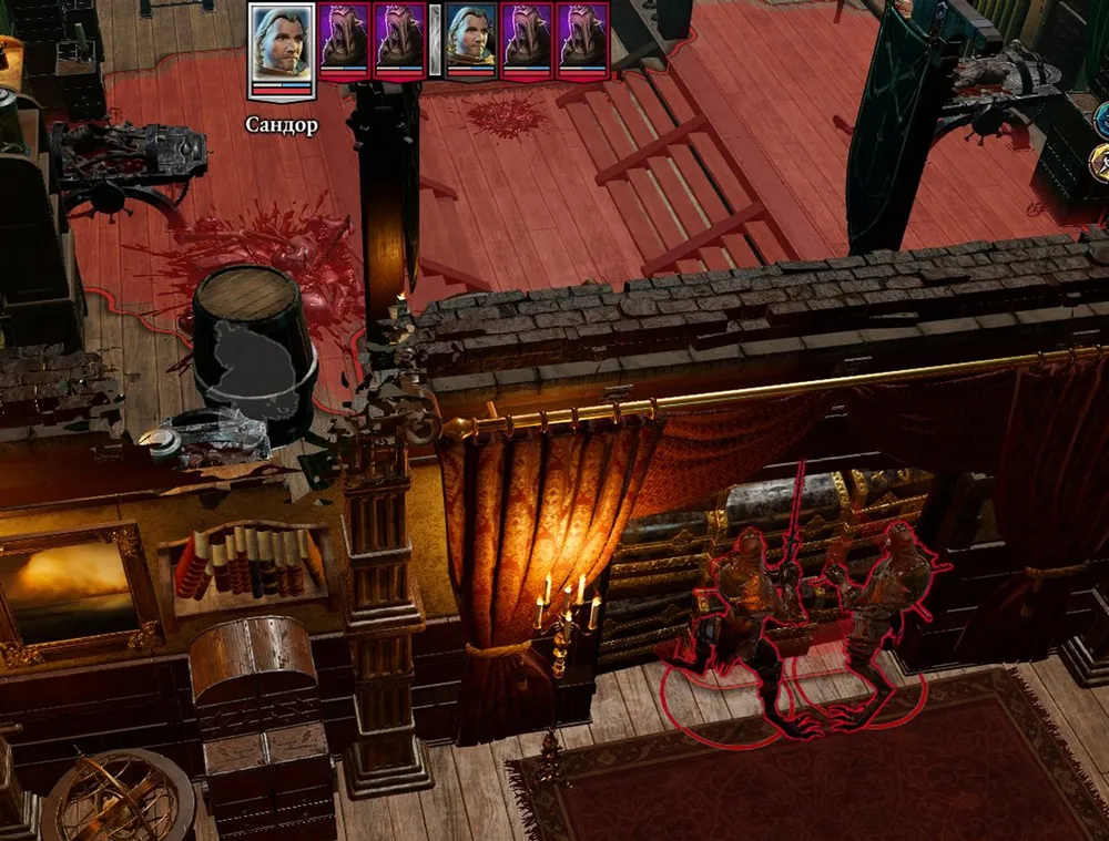 Адрамалих тупо разгуливал туда-сюда по своему дому и очень удивился, переместившись в комнату за преградой. Началась ювелирная работа: несколько ударов оружием, уход в тень и отбежать подальше: кто знает, какое заклинание может применить враг? Демон пытался подорвать трупы, да только Сандор заранее стащил их в один угол.