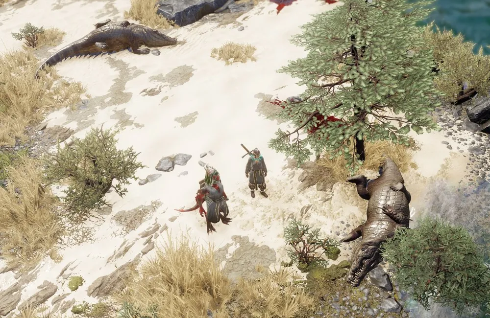 Понятно, разламывать сундуки стоит только на ровном месте, не на берегу. Буквально рядом с сундуком повстречались первые серьёзные враги – крокодилы. В отличие от обыкновенных эти плюются какой-то наносящей урон дрянью, пугают бойцов, а один и вовсе применяет магическое умение.