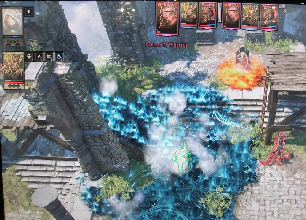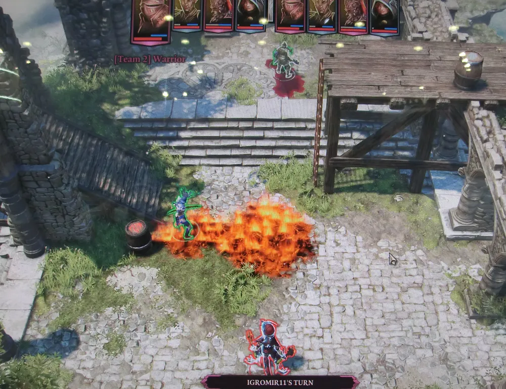 Маг шарахнул по лучнику метеором и вновь поджёг поверхность, которая автоматически благословилось! Лучник вылечился, выпустил по воину взрывающуюся стрелу, следом добавил проникающую (спецатака).