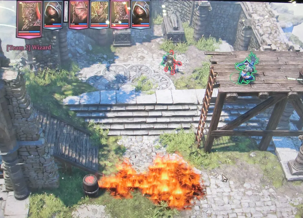 Воин убит, благословение убрано магом, и огонь вновь начинает жечь - лучник запрыгнул на вышку (спецспособность). Однако маг теперь не доступен выстрелам!