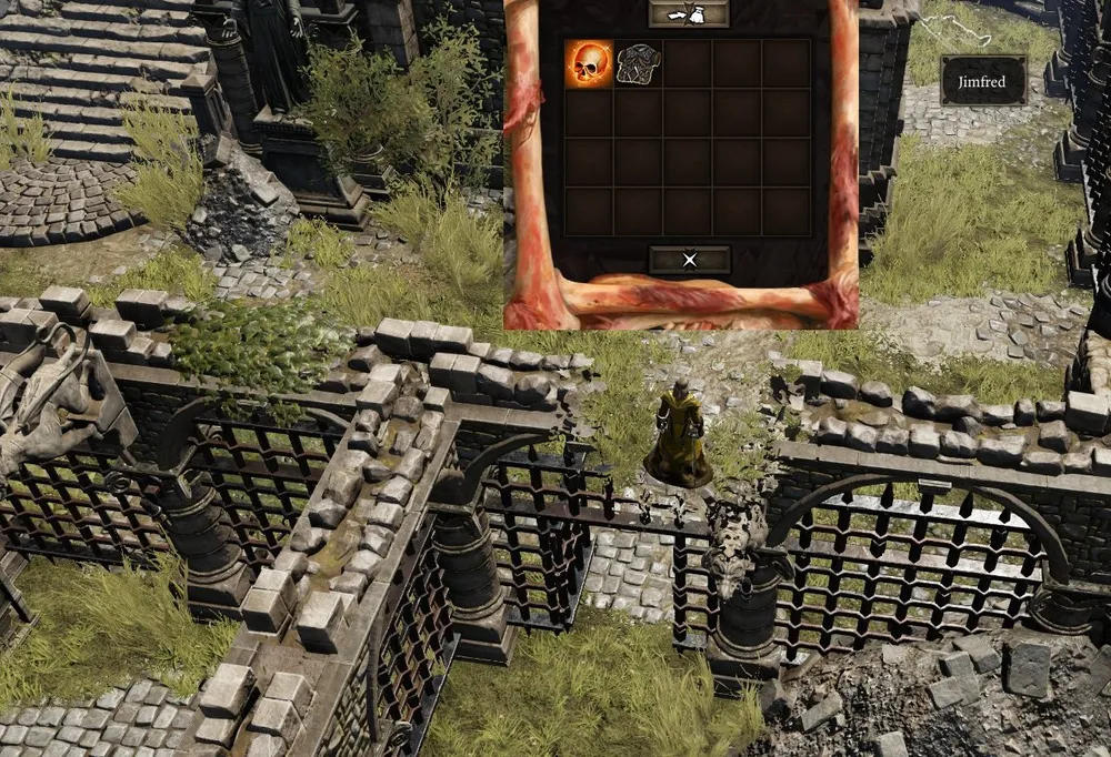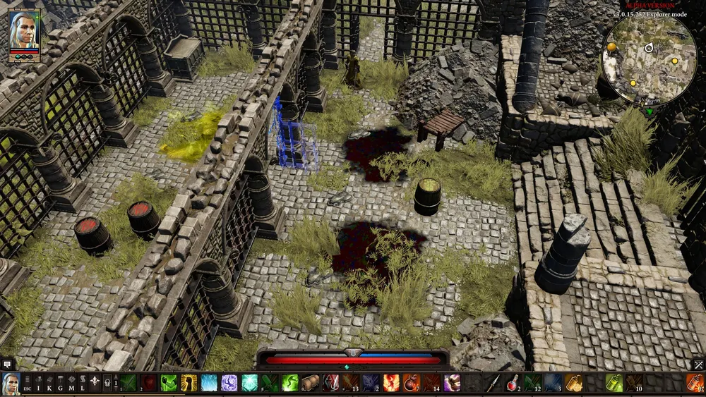Наконец, удалось «правильно» пройти лабиринт. (Надеюсь, что правильно. Кстати, необходимо нести с собой две полные бочки, ещё три можно найти на месте.) Войдя в ворота, ставим бочку на нажимную плиту и забираем череп-ключ.