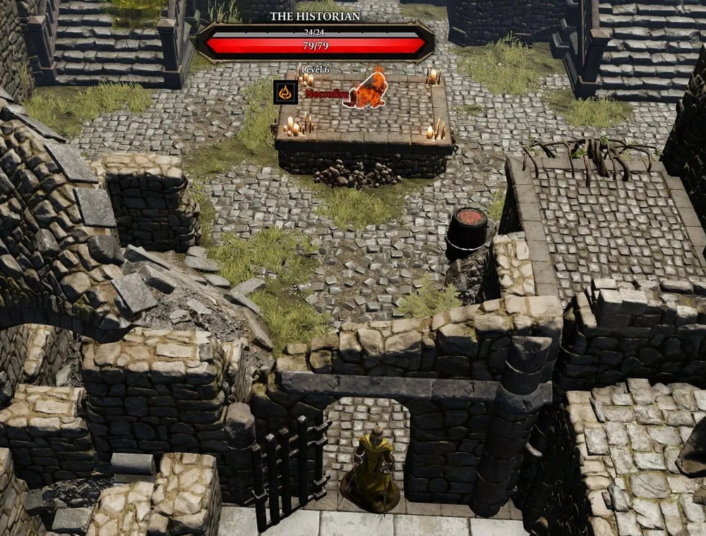 Этот зловредный скелет поджёг героя, но у того уже было благословение. Дальнейшее заставило улыбнуться: мертвец активно наносил удары своими огненными жезлами... и тем самым лечил противника.
