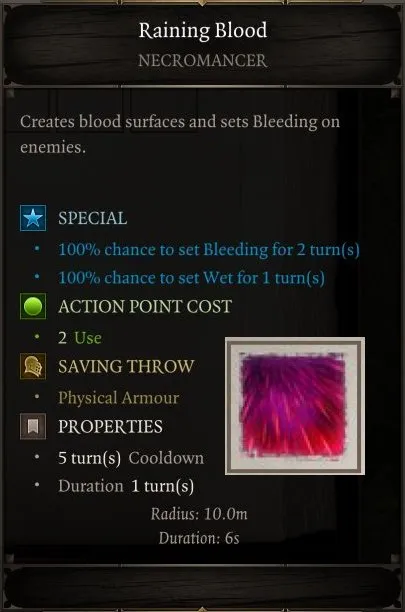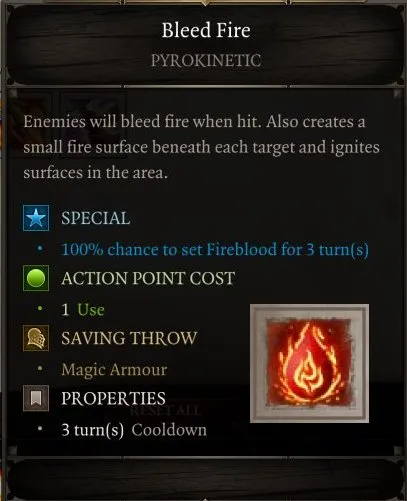 Bleed Fire – огненное кровопускание, воспламенение крови??? После получения урона под целью образуется горящая область. (То есть – сначала примени заклинание, потом – нанеси урон, и цель загорится? Не проще ли выпустить огненную стрелу или огнешар?)