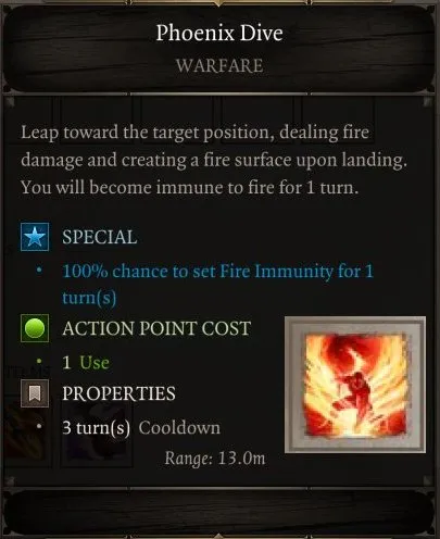 Phoenix Dive – Пике Феникса. Словом, прыжок с поджиганием места приземления. Неплохое умение, позволяющее быстро покинуть поле боя или вступить в бой. Любят враги с двуручным оружием.