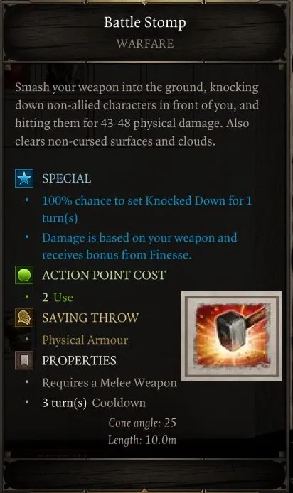 Battle Stomp – Топот войны. Воин наносит урон по определённой зоне впереди себя, всем попавшим в неё врагам.