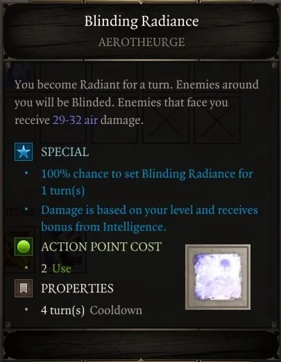 Blinding Radiance – Ослепляющее сияние.??? Враги слепнут и получают урон от магии воздуха.