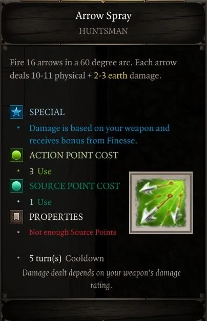 Arrow Spray – «Дождь стрел»? Требует магии источника. Я успел испытать этот навык: к моему величайшему недоумению и негодованию демон остался жив. Если уж навык требует магии источника, то он просто обязан убивать врага единственным применением. Впрочем, игра «заточена» под команду – особенно удивляться нечему: предполагалось, что спутники героя легко добьют монстра.