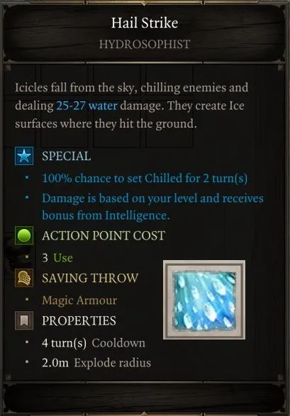 Hail Strike - «Приветствие градом»? Бьёт по площади, может заморозить противника. Если у врагов мало магической защиты – самое оно.
