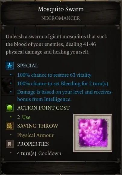 Mosquito Swarm – Рой москитов. Злобные комары высасывают жизнь из врагов и передают такое же количество жизненной силы герою. Проще говоря – опосредованный вампиризм.