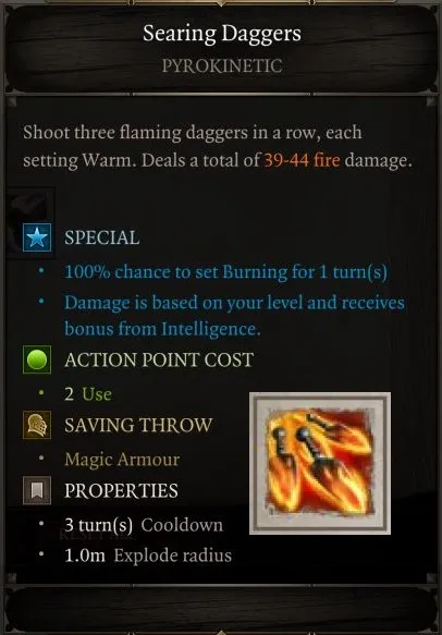 Searing Daggers – Огненные кинжалы. Три кинжала наносят дистанционный урон огнём.