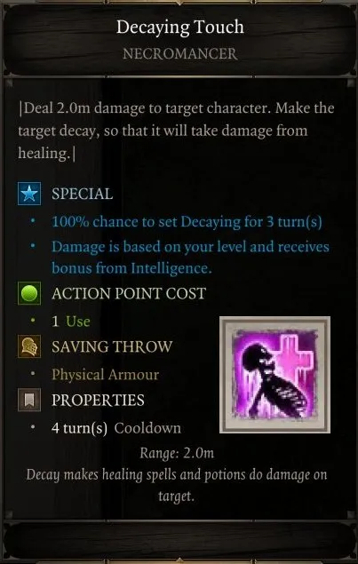 Decaying Touch – Прикосновение гнили. Враг начинает гнить и получает урон от лечения. (Два заклинания подряд – из разных школ! - для нанесения урона? Трудно быть магом!)
