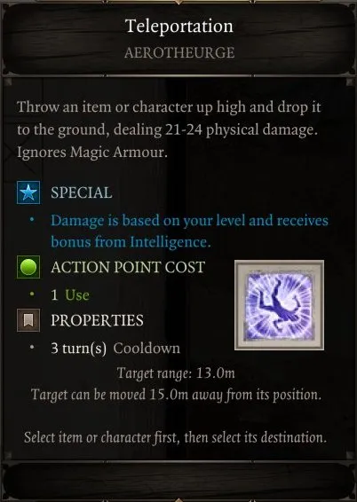 Teleportation – Телепортация. Закинуть врага в огонь, уронить его с высоты, отбросить от себя подальше и сбежать, переместить напарника через пропасть к секретному месту. Книга телепортации – на втором этаже цитадели; наручи телепортации – у одного из крокодилов.