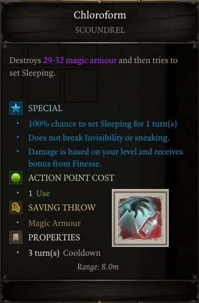 Chloroform – Хлороформ. Уничтожает магическую защиту противника. Пожалуй, навык полезен – в команде: вор снимет защиту, маг применит заклинание. (Одиночке некогда заниматься ерундой, он обязан наносить прямой урон.)