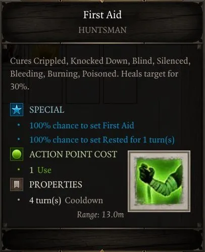 First Aid – Первая помощь. Лечит и снимает некоторые неприятные эффекты. Умение особенно полезно в самом начале игры.
