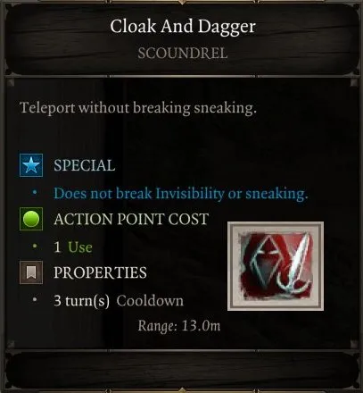 Cloak and Dagger - Плащ и кинжал. Прыжок в сторону. Или – за спину, чтобы обчистить карманы. (Причём вор не покидает тень!) Если прокачан навык невидимости, можно потрошить сундуки под носом у врагов и безнаказанно грабить стражников.