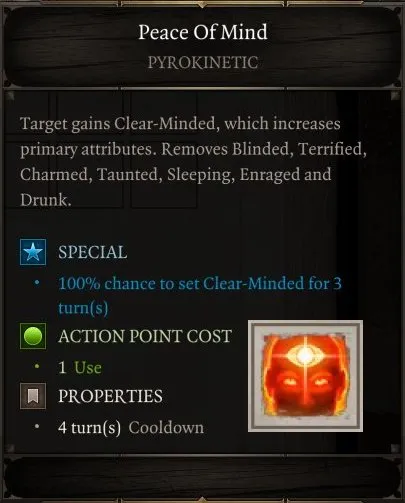 Peace Of Mind – Спокойствие духа. Удаляет ослепление, испуг, очарование, сон и некоторые другие отрицательные эффекты.