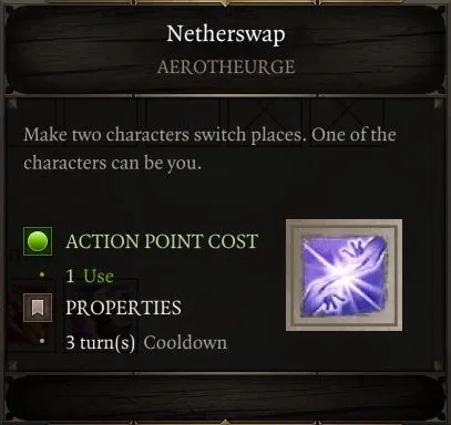 Netherswap – Обмен. Вознести наверх вражеского мечника – пускай спускается! – и опустить на его место вражеского лучника – пусть не смеет стрелять безнаказанно! Или ворваться в толпу врагов, поменявшись местами с одним из них. (Не действует на предметы и трупы.) Повелитель подвалов цитадели Kniles the Flenser, проигрывая бой, подставляет вместо себя «зомби»; маг из охраны лодок раз за разом менял местами героиню и голема, занося тем самым её в центр и подставляя под все удары.