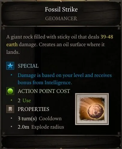 Fossil Strike – Удар окаменелостями. Во врага мечется земляной шар, наносящий урон, образуется масляная лужа, замедляющая передвижение. Любят применять крокодилы и некоторые из вражеских магов.