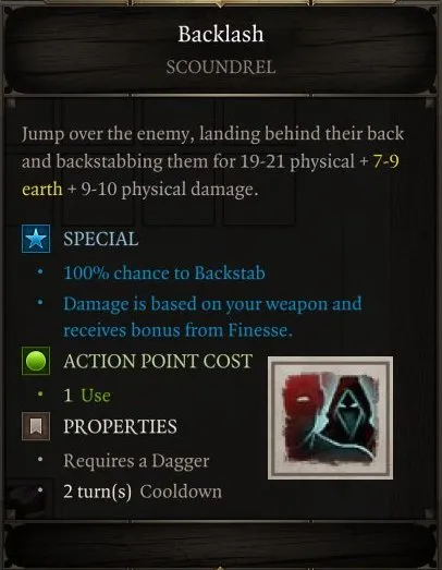 Backlash – внятного перевода не нашёл, пусть будет «Удар в спину». Вор мгновенно оказывается за спиной противника и наносит увеличенные повреждения. Последующие удары также наносятся в спину, с большим уроном. (Если враг стоит близко к краю обрыва или стене – может не сработать; увеличенный урон нанесёт только первый удар.) Два-три раза за игру могут применить враги: хорошо, что среди них мало воров!