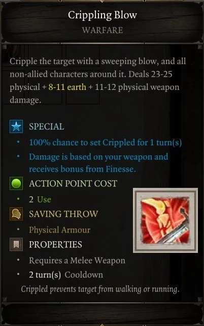 Crippling Blow – Калечащий удар. Калечит цель стремительным ударом и всех противников вокруг неё.
