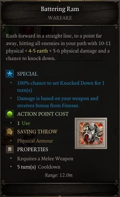 Battering Ram – Таран. Воин мгновенно сближается с врагом, сбивая его с ног (при отсутствии физической защиты!) и нанося урон. Очень любят использовать враги с двуручным оружием.