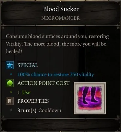Blood Sucker – Кровосос. Очевидно, сначала требуется применить «Кровавый дождь», без него заклинание не будет эффективным. (Или просто встать в лужу крови на поле боя?)Отнимает жизнь у врагов и передаёт герою.