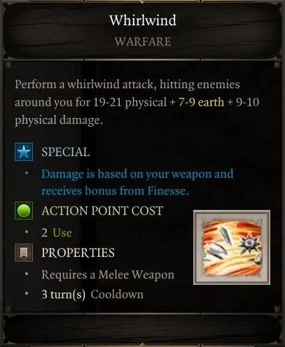 Whirlwind – Вихрь. Круговой удар. (Возможно, урон будет нанесён многим врагам.) Любят применять противники с двуручным оружием.