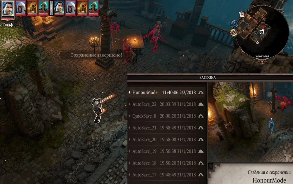 То, что это зловредный баг, подтвердилось позже, в подземелье Лабиринта горгульи: сохранил игру перед разговором с тремя скелетами-картёжниками, поговорил, но в этот раз сказал что-то не то: нежить перешла в режим боя. И тут игра «самосохранилась»! (Успел сделать скриншот. Вот интересно, а создатели игры тестировали её в режиме «Доблесть»?) Хорошо, что всё произошло неподалёку от выхода наружу.