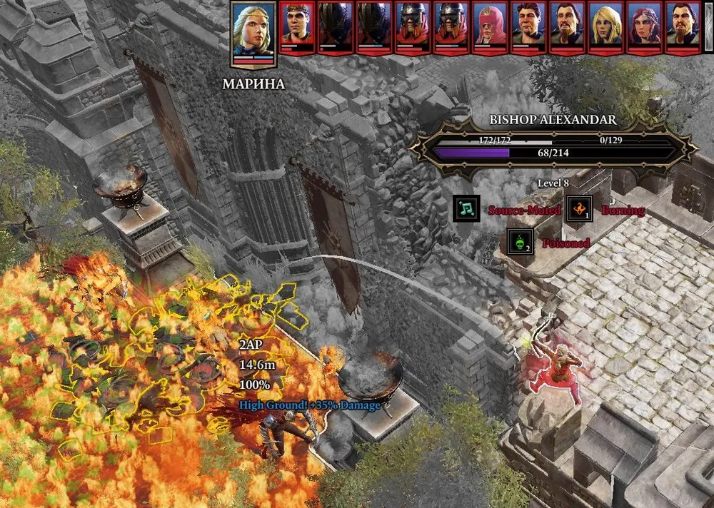 Сохранил игру, пустил стрелу – неудачно, враг не погиб. (Точнее, потерял меньше половины здоровья.) Надо было сразу загружать игру, а я решил попробовать добить Александра. И дождался: он применил «Рокировку», телепортировал наверх лучницу, а героя поместил в створ ворот. И ТУТ СРАБОТАЛО АВТОСОХРАНЕНИЕ! Что за чертовщина?! Вышел из игры, создал новую, дошёл до ворот, в невидимости прошёл сквозь них: автосохранение игры происходит раньше, до прохождения героя через ворота. Очевидно, баг! Фатальный, конечно же…