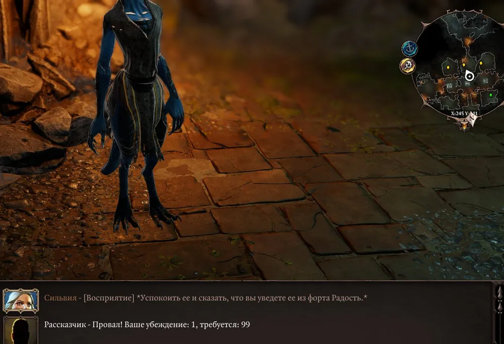 Провалил квест с поиском собаки (среди боевых в подвале форта): боялся, что единицы убеждения не хватит, набирал опыт и сразился с охраной подземной пристани. Вероятно, именно из-за этого собаки стали враждебны, сделав невозможным разговор.