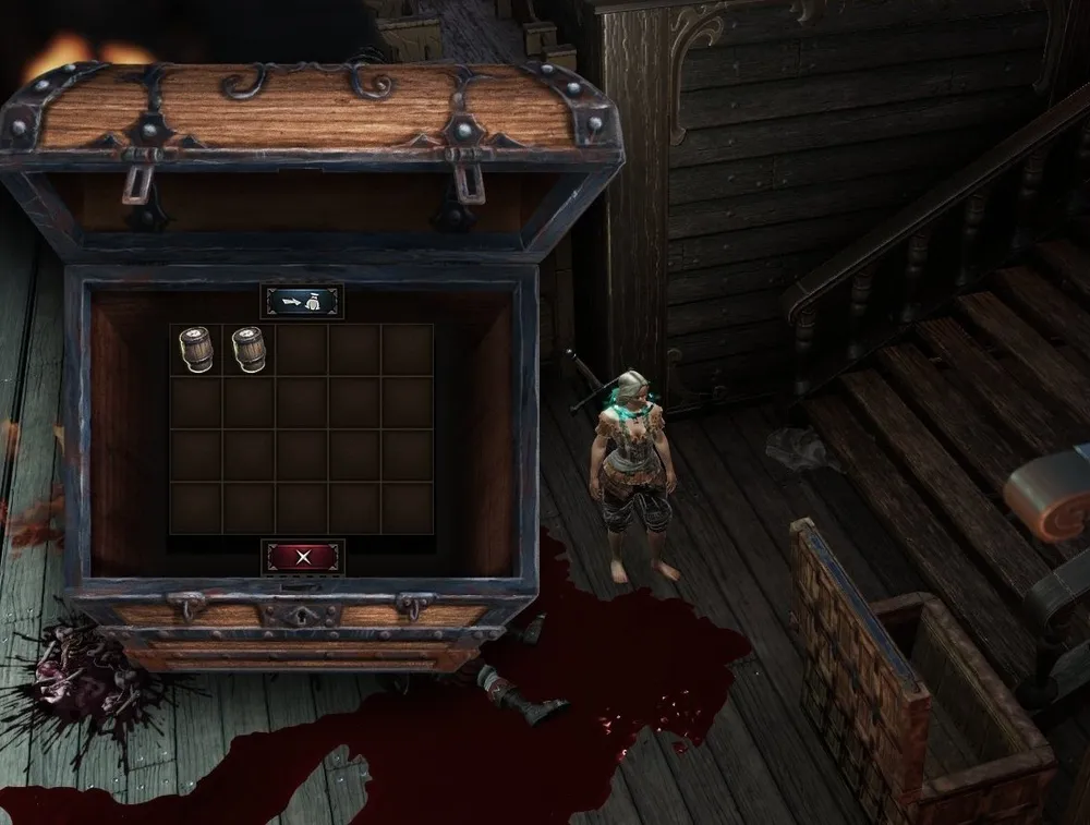 Нет, я не согласен на одну бочку! Взял в рюкзак сундук, подхватил обе бочки и загрузил в него. Затем выложил сундук наружу и принялся «кантовать» к лестнице. Спустился, поставил внизу рядом с лестницей второй сундук и переставил бочки в него.