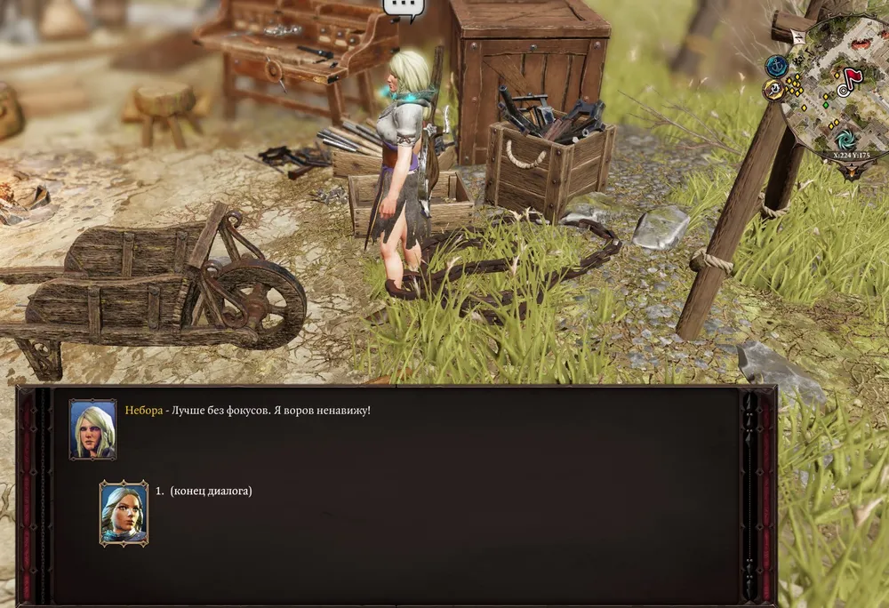 Героиня и не пыталась, Небора постоянно расхаживает среди предметов, и курсор случайно попадал по ним. Оба раза игра была загружена, вот только не поздно ли: ещё на корабле героиня случайно угодила по мячику и получила замечание от стражника. Теперь гадаю, сочтёт система данный эпизод за попытку кражи? Старался никого не убивать зря и даже не атаковать первым.