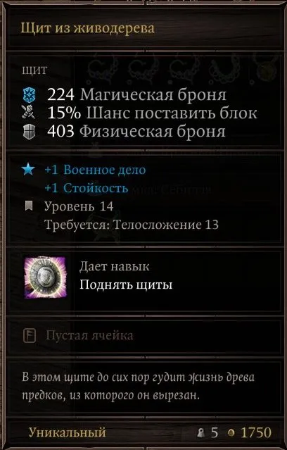 Духа пришлось поглотить (вот и всё, «Путь крови» непроходим!), взамен бревно подарило отличный щит, бесполезный для моих амбидекстеров. (Кстати, его нельзя продать. Квестовый предмет?)