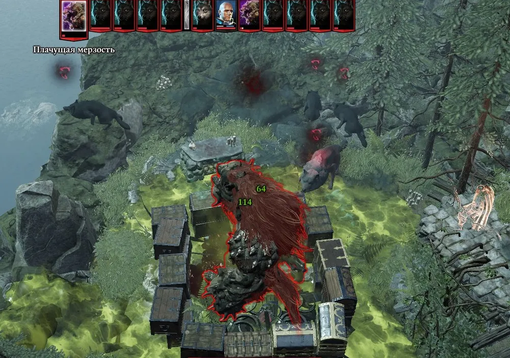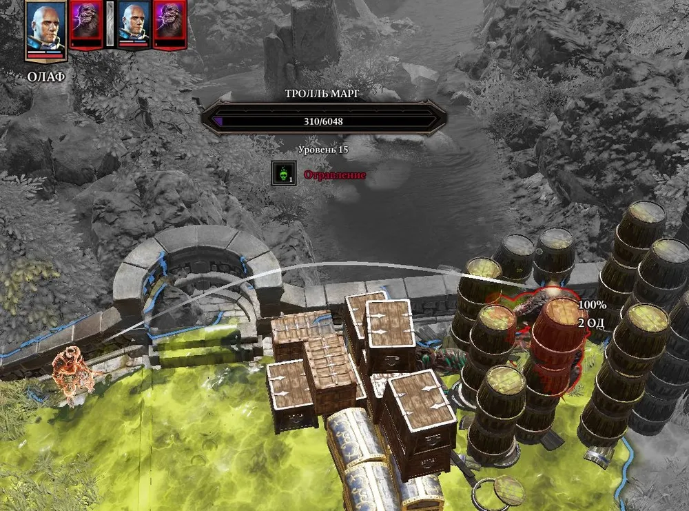 Герой применяет дождь, и на этот раз бочки не взрываются. Правда, монстр всё равно делает первый ход, несмотря лужу нефти (я поставил одну бочку для замедления). Уходим на выступ, кидаем в волков «Гранату любви» и прячемся в тень. Вот когда пригодился большой запас ядовитых стрел!