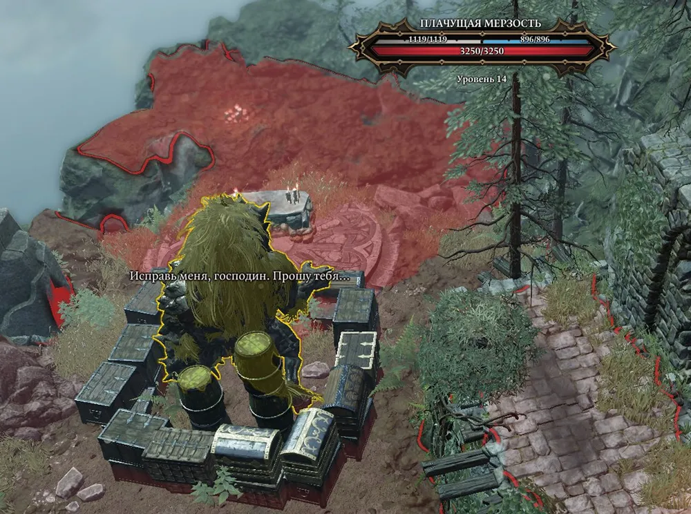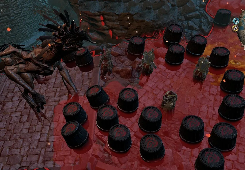 Например, с Плачущей Мерзостью. Схема та же, но в этот раз установлено всего пять бочек – должно хватить. Однако сразу после разрушения бочек как шарахнуло! И весь яд превратился в море огня… Что такое?! Повторяем – опять взрыв! Хм… Как вы думаете, что произойдёт, когда волна абсолютно горючего яда накроет горящие вокруг алтаря свечи? Вот и я о том же.