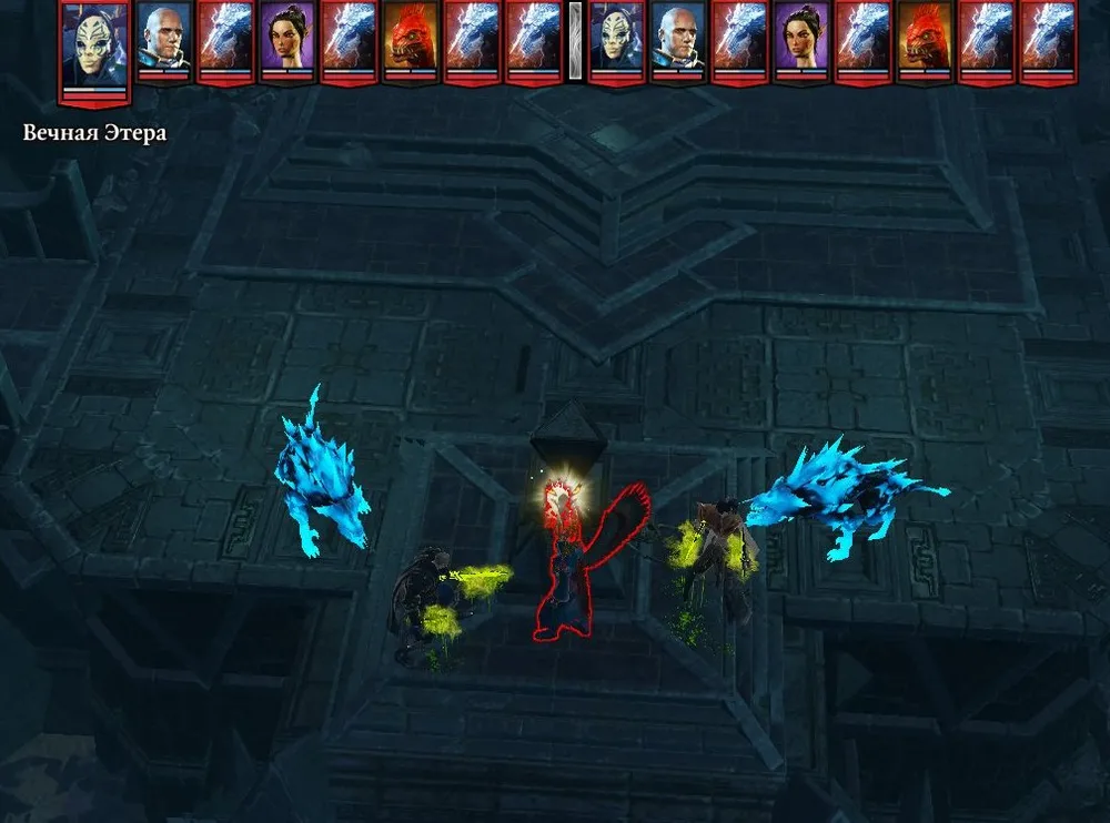 Решил завершить квест по обследованию Чёрных копей, выданный паладином Томом Хардвином. Спустился к древнему храму и сразу разделил отряд: эльфийка осталась внизу открывать гробницу, а её напарники заняли места справа и слева от предполагаемого места телепортации Вечной Этеры.