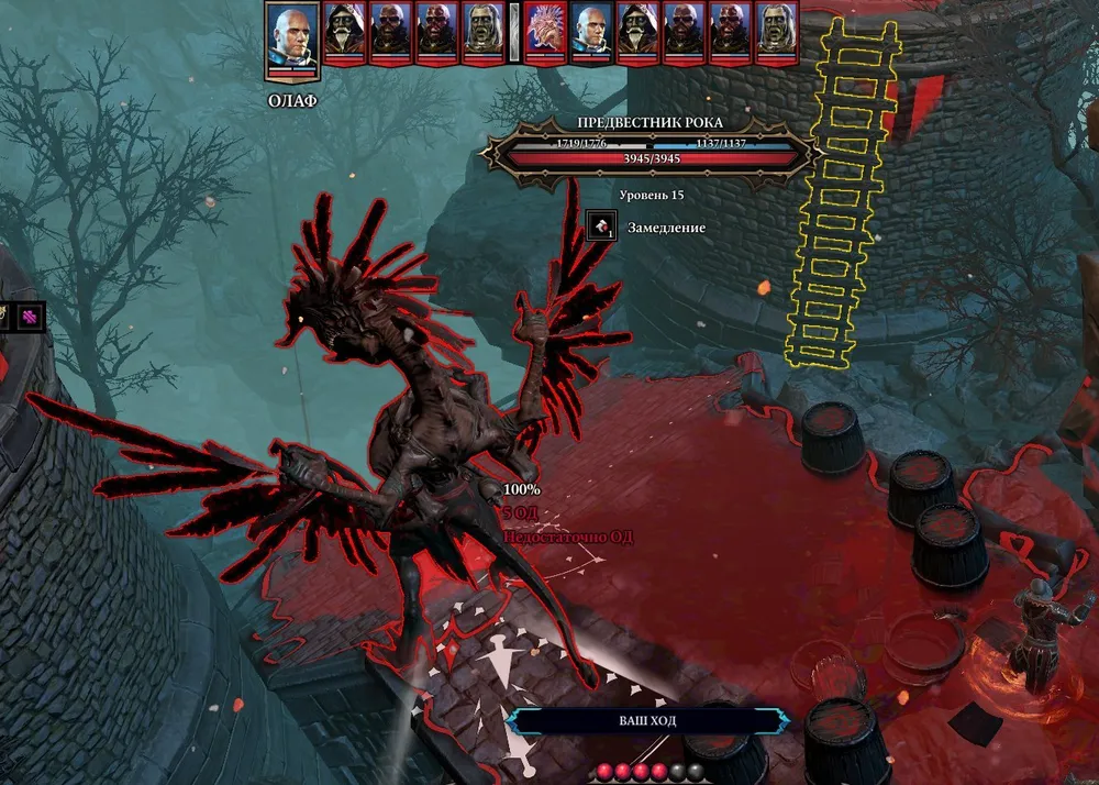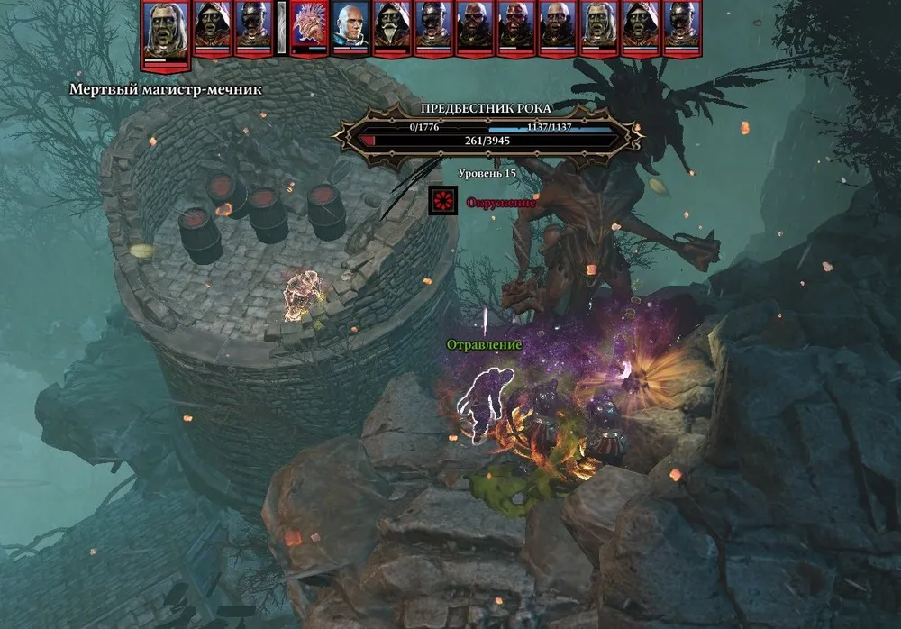 Герой проскользнул на башню, и залетали через гиперпространство бочки с нефтью. Главное – не попасть раньше времени бочкой в голову перемещающемуся врагу. Взрыв – зомби лишились магической защиты, но не сгорели, а Предвестник Рока опять прикончил героя в первом же раунде. Если нельзя ходить раньше, чем враг, значит, нужно его затормозить в начале боя.