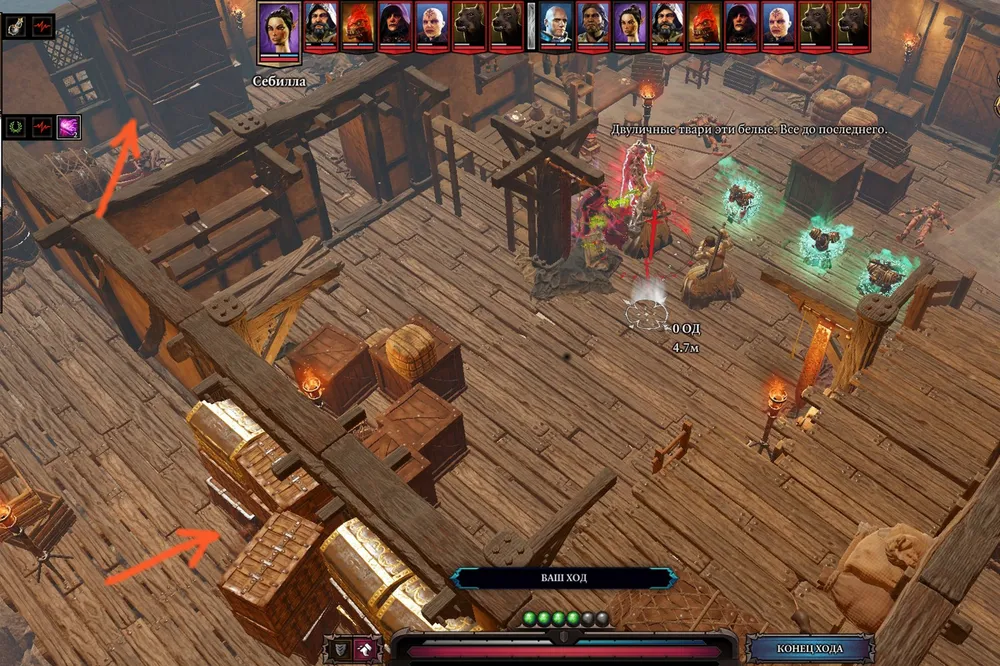 В общем-то, я перестарался: хватило бы пары бочек и одного ряда «сундучной» стены. Стреляем в бочку обычной стрелой и уходим в тень, не давая врагу сделать ход.