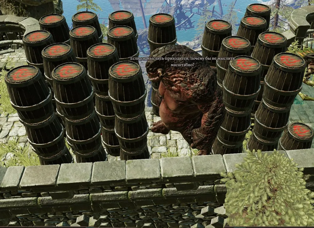Не пора ли ополчиться на «Боссов»? При помощи бочек? Герой стоит у насоса, ящер подаёт ему пустые бочки из сундука на «Госпоже мести», эльфийка просто наблюдает. Долго, нудно, но как иначе?