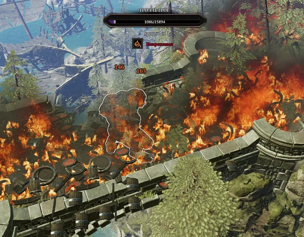 Не напасть ли на тролля, охраняющего мост? Того, у которого кольцо пятого уровня. Бочек мне, бочек! Да только бочки не получается установить выше трёх рядов (два уровня телекинеза), а подойти ближе не позволяет вымогатель. И мост не слишком широк… Ладно, шести десятков должно хватить! Мало, жив. Восемьдесят – жив. Сто – весь лес в огне, захлестнуло Эитне, она сделалась врагом, а Грог жив! Бежит через огонь «разбираться»! Быть может, сделать его «своим», пусть несётся сквозь пламя к врагу-скелету, авось сгорит? Не работает – тролль и скелет гоняются друг за другом, на втором-третьем ходу исчезают из вида, и бой прекращается.