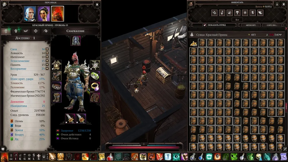 Уровень – бежим по торговцам. Ура! После шестнадцатого уровня в продаже появляются предметы со статусом «Божественный» и большие бутылки с зельями! Вот только золотой запас стремительно тает: с девяноста тысяч он ушёл в минус, пришлось отдавать натурой. (Стрелами и зельями, конечно же, а не то, что подумали некоторые.)