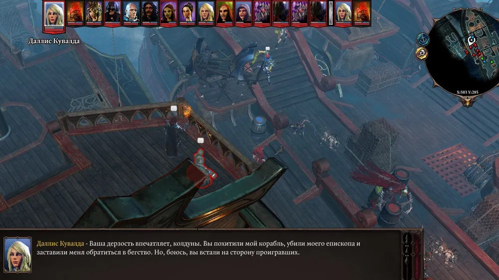 На этот раз «бесполезные» банки с мозговыми паразитами были использованы для изготовления гранат: не смотря на отсутствие рецепта. И когда оказалось, что у «собак», входящих в состав абордажной группы, нет защиты от магии – применены против них. Очарованные звери запрыгнули на палубу вражеского корабля и напали на Даллис и её спутника! Вот это да! Быть может, в следующий раз стоит попытаться с их помощью (усиливать-лечить) уничтожить главных злодеев до финала? (Интересно, такой вариант предусмотрен? Он не приведёт к «зависанию» игры? Надо проверить!)