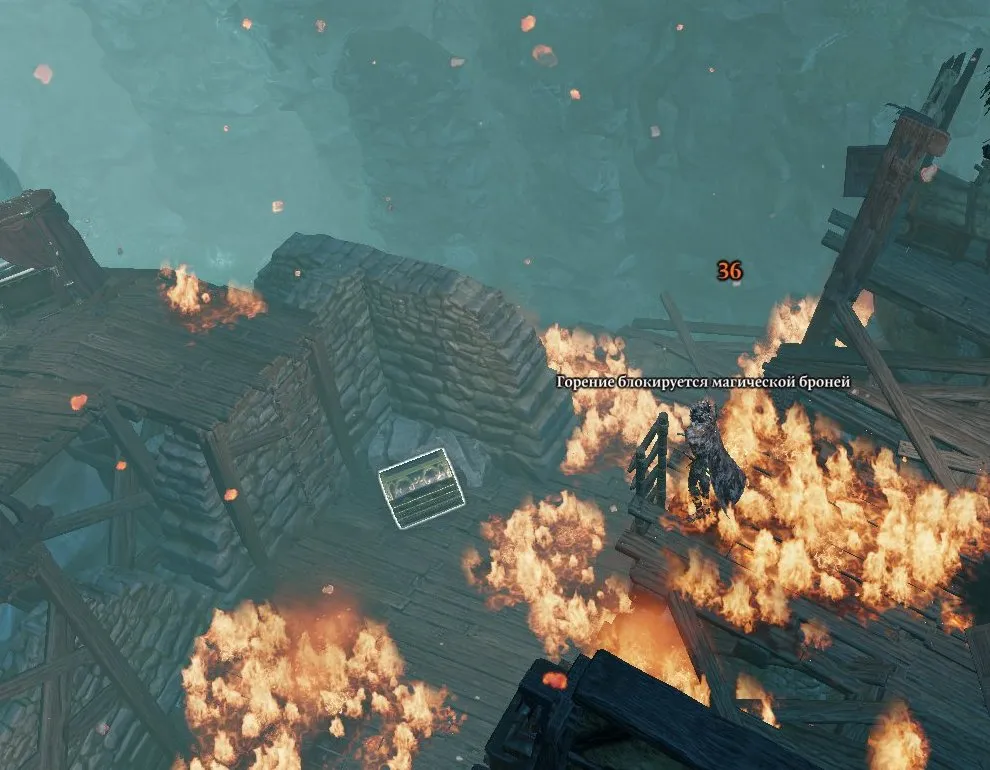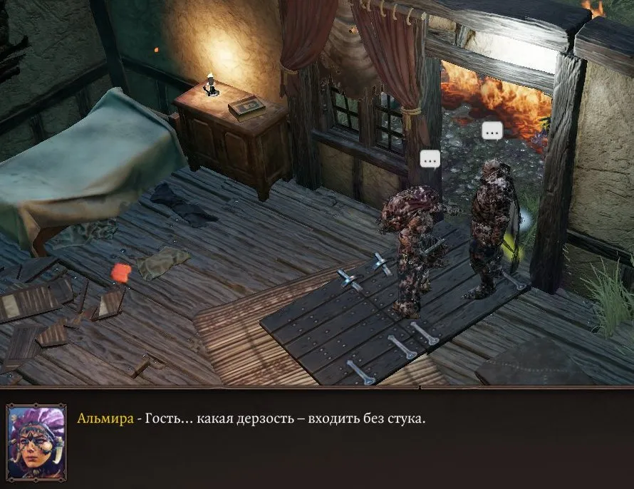 Попытка уничтожить исчадий у подъёмного моста заканчивается гибелью ящера и эльфийки, герой чудом уцелел. Похоже, сражаться рановато…