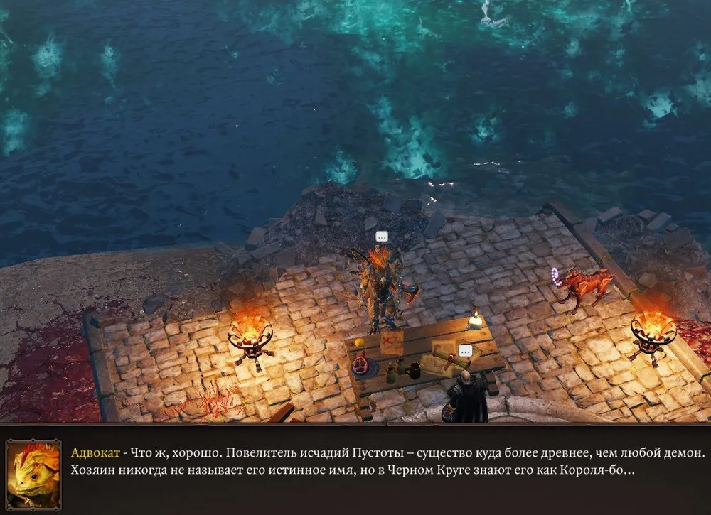 Разговариваем с Адвокатом и становимся перед выбором: принимать или нет его задание? Если принять – вряд ли получится пройти путь Крови в будущем; зато получим ещё один слот магии Истока. Атаковать? Можно, конечно, попробовать – с предсказуемым результатом. Зато стоит убедить его открыть имя повелителя исчадий Пустоты.