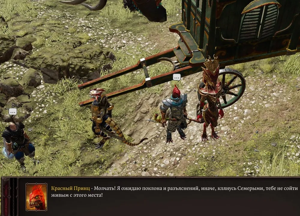 Кто остался? Только застрявший караван. Красный Принц поселяется на корабле, а герой и эльфийки отправляются в путь. Общаются с торговцами, попутно грабя неосторожных (а чем прикажете задабривать? На что покупать снаряжение?) и избегая разговора с ящерами – вдруг спросят о Красном Принце?