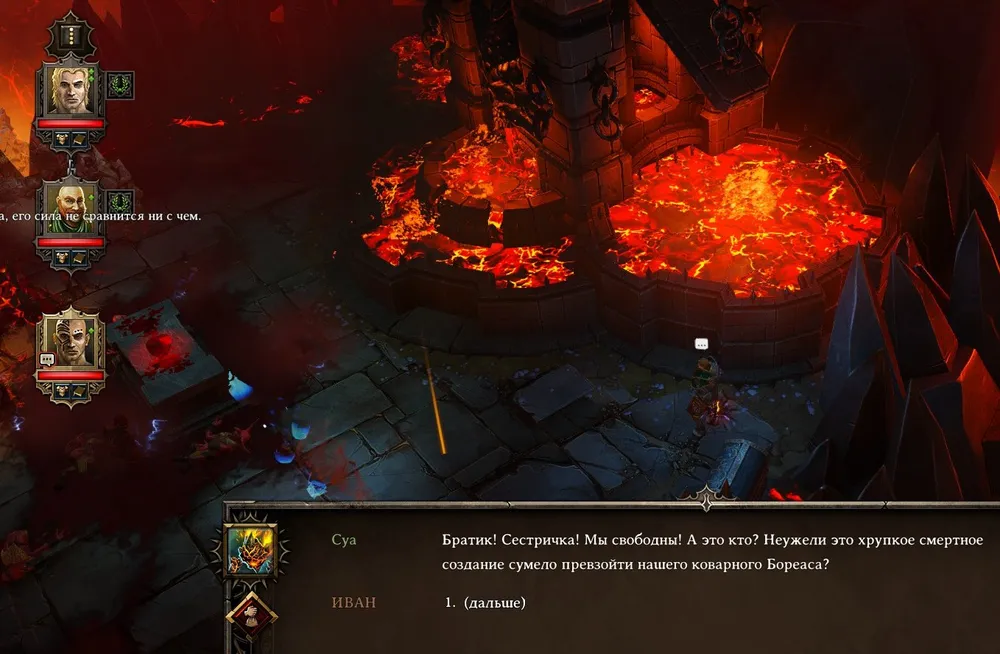 Не получилось и в этот раз: Пифия, не обращая никакого внимания на защиту, шокировала отряд, затем спустилась с возвышения и подобрала кровавик. Нет, так не пойдёт! Новый возврат во времени и новый, ещё более коварный план: группа разделяется, Младший отвлекает колдунью разговором, Старший «телекинезирует» кровавик в сторону Вольграффа, тот подхватывает его и убегает. Получилось! Братьев, конечно, парализовало, но вор находился вне поля зрения Пифии, успел подхватить камень и убежать. А для гарантии даже отправил его в Конец времён. И… всё замерло.