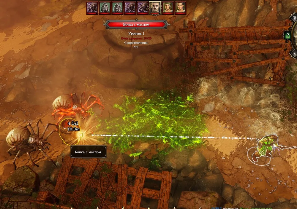 Очень быстро герои поняли, что виноват песок, и отступили к мосту; где и положили конец существованию восьминогой твари. После чего приняли следующую тактику: Рыцарь остаётся в засаде на мосту, а Следопыт, умеющий быстро перемещаться и защищённый от замедления, отправляется на разведку. Новая порция яиц. Ухмыляющийся лучник ставит рядом масляную бочку – будет яичница! Взрыв, море огня, жареные пауки и…ноль опыта. Враг не увидел героя за облаками дыма, не вступил в бой и погиб просто так, от неизвестного пожара, а вовсе не по желанию одинокого волка.