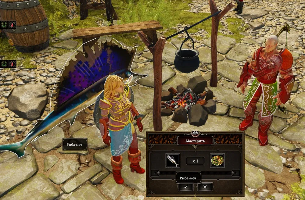 Вот когда пригодились запасы продуктов, скопившиеся в рюкзаках героев! Черновой работой - вроде превращения с помощью молотка помидоров в кетчуп, а картофеля в пюре - занимался Следопыт. А готовила, конечно же, Рыцарь - благодаря развитому умению «рукоделие» у неё это получалось лучше.